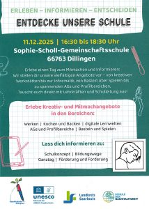 Auch in diesem Jahr hat die Sophie-Scholl Gemeinschaftsschule Dillingen erfolgreich die Berufsinformationstage für die Jahrgangsstufen Neun und Zehn durchgeführt. Die Veranstaltung, die als wichtige Schnittstelle zwischen Schule und der Arbeitswelt steht wurde durchweg positiv bewertet. Die Betriebe und Unternehmen lobten das große Interesse und die vielen höflichen und interessanten Gespräche mit den Schülerinnen und Schülern. […]